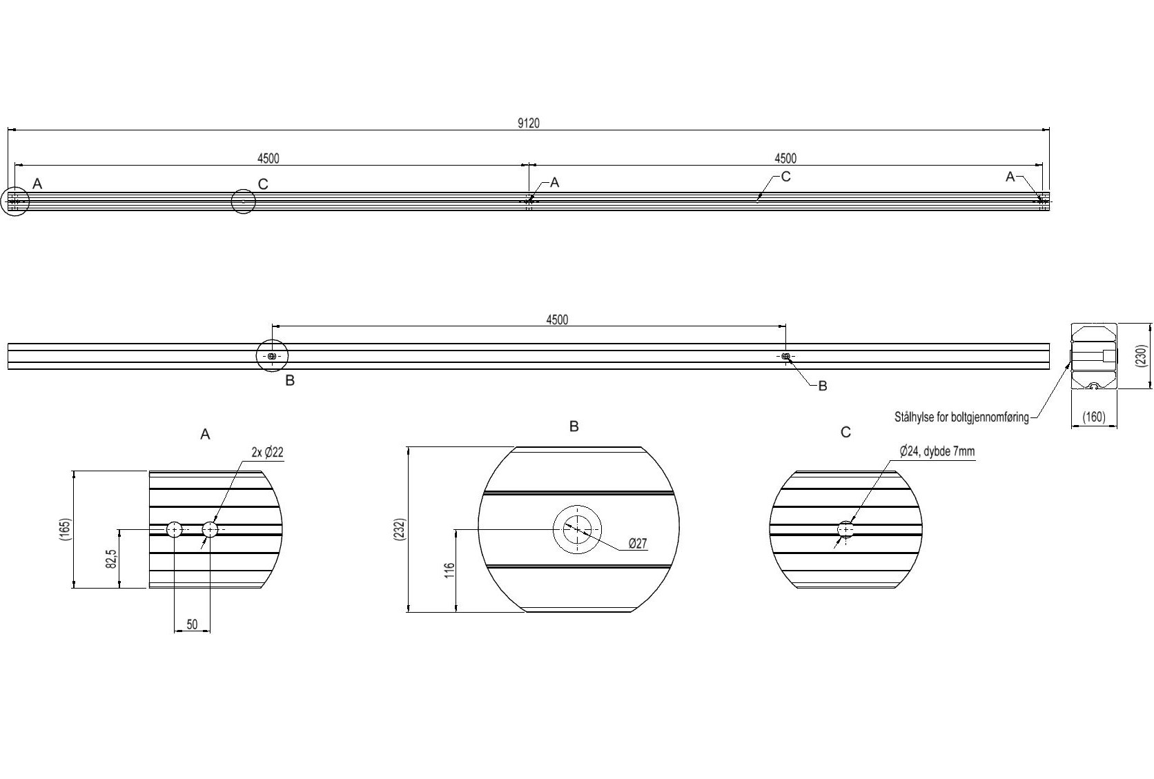 Anchoring crossbar for two-sided connection. 2-pole. Pole distance 4.5m, phase distanse 4.5m. Must always be used with support. Bolted connection M24.