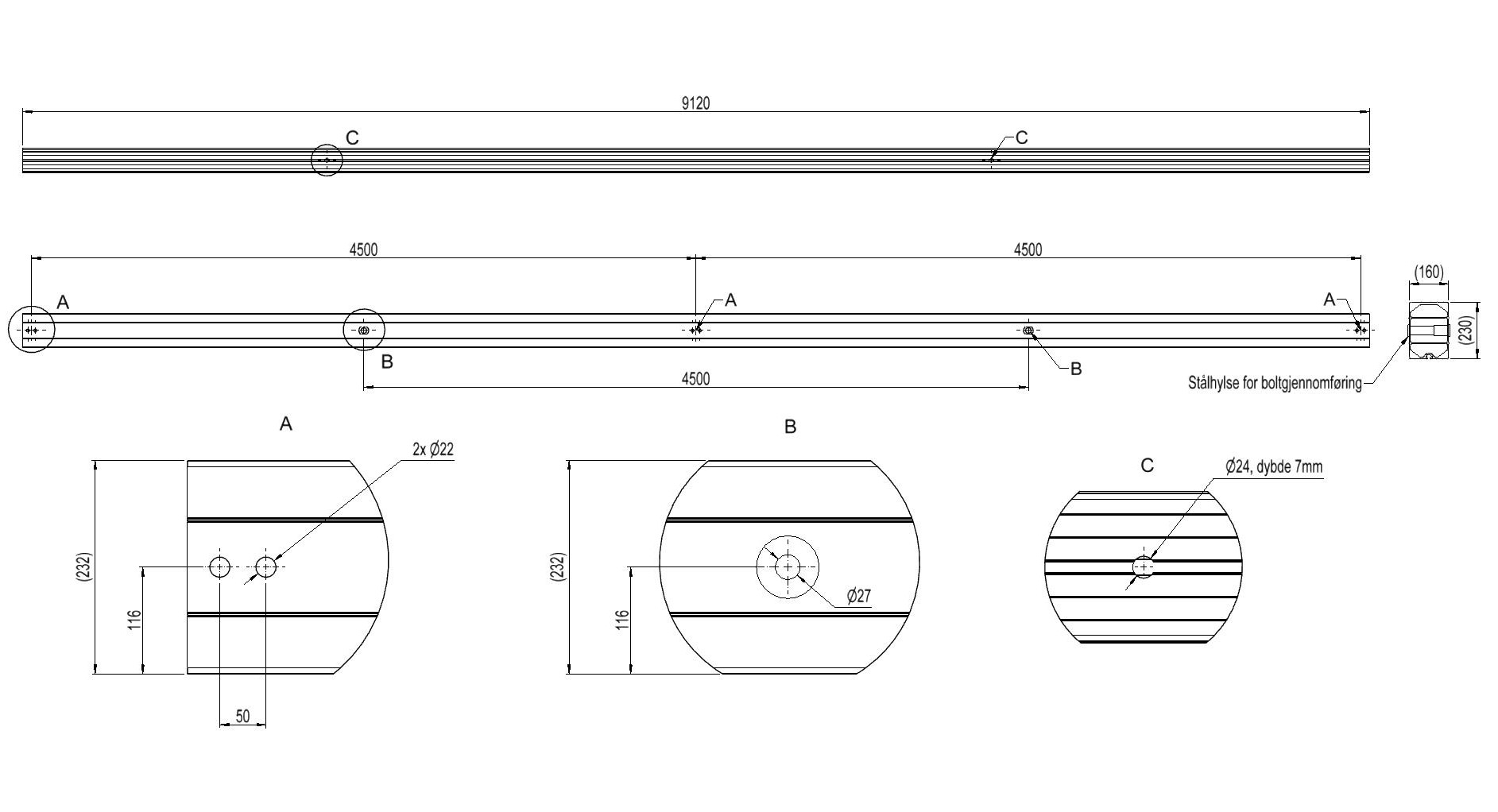 Load-bearing crossbar. 2-pole. Pole distance 4.5m, phase distanse 4.5m. Must always be used with support. Bolted connection M24.