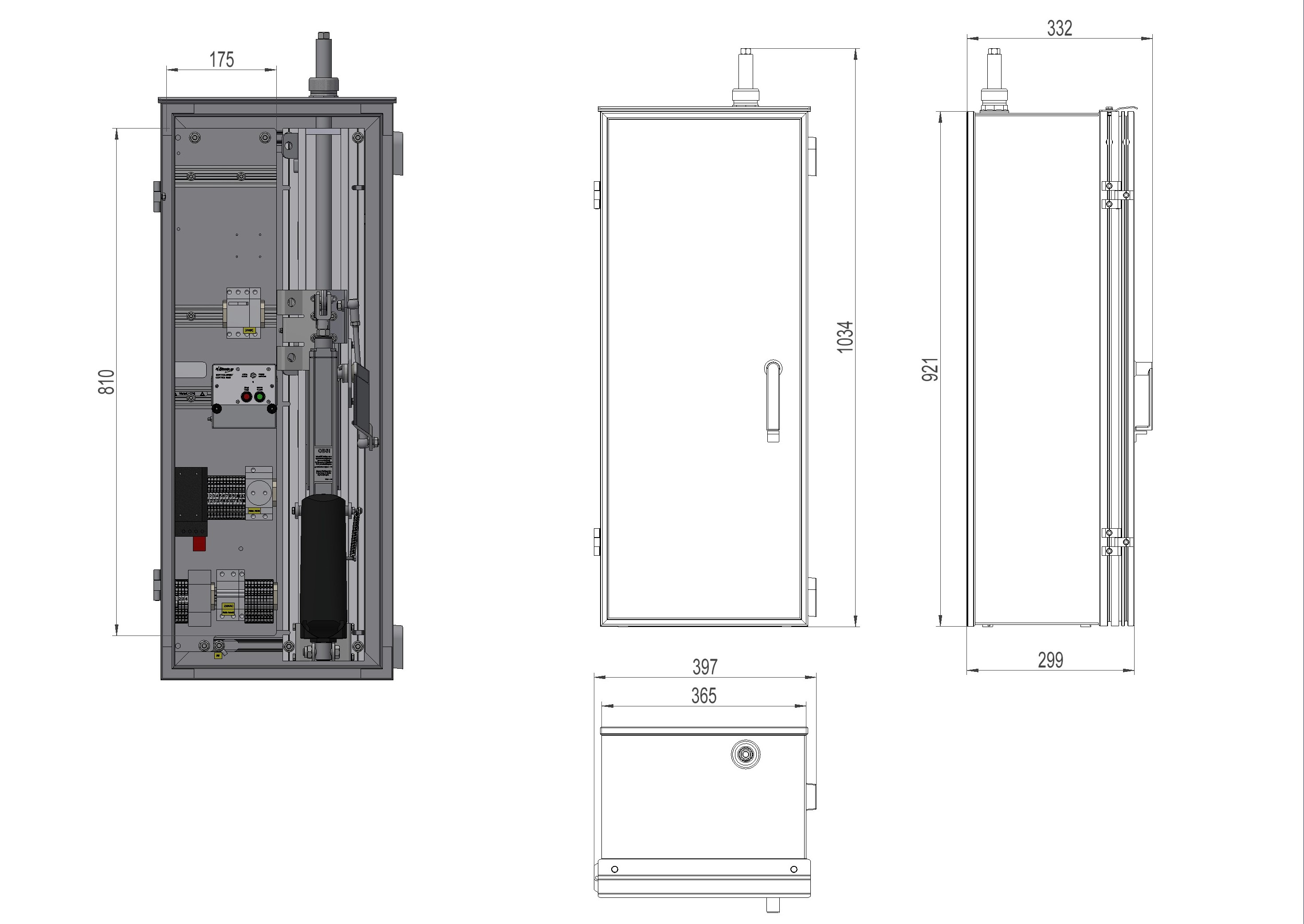 Bryterstyring med moment, uten batteri og lader. Slaveskap som forsynes med 24VDC fra en nærliggende Bryterstyring. 250mm slaglengde. Uten kundeplate. Aluminiumsskap 370x920x300mm.